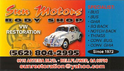 Sun Motors Body Shop is the shop that has done the beautiful restoration of Project Käfer. Need a new look? All you have do to is give Sun Motors Body Shop a call. They have been in Bellflower, CA for over 30 years. Same place, same owner. They do all Volkswagen bodywork: Bugs, Busses, Ghias, Notchbacks, and even the occasional domestic car. They give free verbal estimates, but you have to bring your classic car in for a quote. Check them out here. |